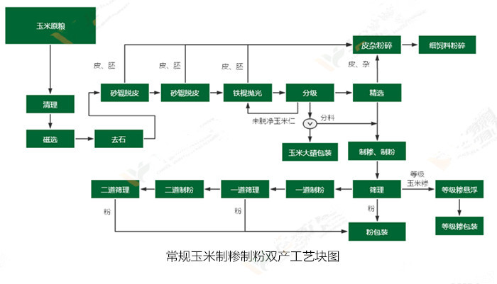 玉米加工成套設備通過對玉米的清理、去皮、破渣、分級、提胚、整粒、拋光、磨粉、平篩分級等一系列工藝,可同時生產出玉米胚、不同粒度的玉米粉,脫脂玉米粉等產品,來滿足不同用戶和食品加工業的需求。